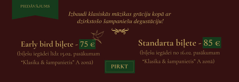 Aicinām jūs uz izsmalcinātu salonmūzikas vakaru Benjamiņu nams greznajās zālēs, vietā, kur elegance, dzīva klasiskā mūzika un izcils šampanietis saplūst vienotā, nepārtrauktā baudījumā. “Klasika & Šampanietis” ir vakars, kas pilnībā veltīts klasiskās mūzikas komponista Jēkabs Tutiņa oriģinālmūzikai, apvienojot to ar šampaniešu nama vēstneses Baibas Misas - Ramanes šampanieša degustācijas stāstījumu.
